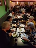 Mit den gefüllten Tellern verlagerten sich die Unterhaltungen an die Tische, und so konnte man nicht nur das leckere Essen genießen (siehe links), sondern sich auch gegenseitig auf den aktuellen Stand bringen, wo man gerade lebt und wie es mit Familie und Beruf so ausschaut. Aus aktuellem Anlass wurden hier und da natürlich auch Putins Krieg gegen die Ukraine und seine Folgen sowie die Corona-Pandemie thematisiert, aber im Wesentlichen ging es doch um uns, alte und neue Geschichten aus unserer gemeinsamen Zeit und dem Leben danach, Anekdoten und Erinnerungen.